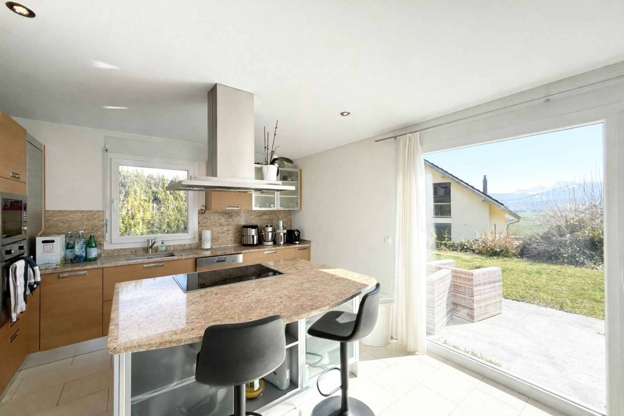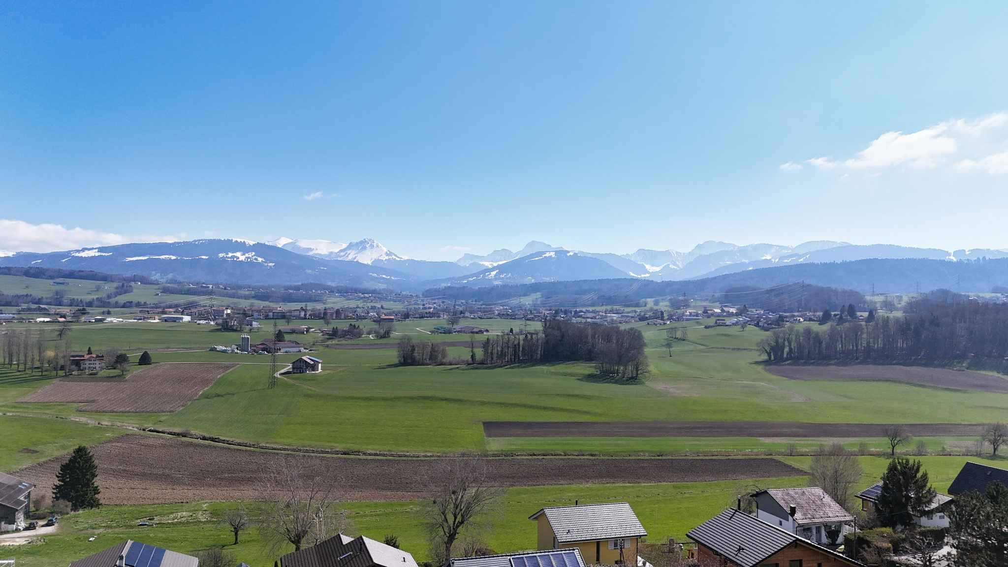 À Granges (Veveyse), dans un quartier résidentiel calme entre campagne et commodités, cette villa individuelle de 2007 s'inscrit dans un environnement ouvert et lumineux. Depuis la terrasse de 100 m², le regard porte sur les Préalpes fribourgeoises. On est à la campagne, mais la gare est à quelques minutes à pied, sans nuisance.